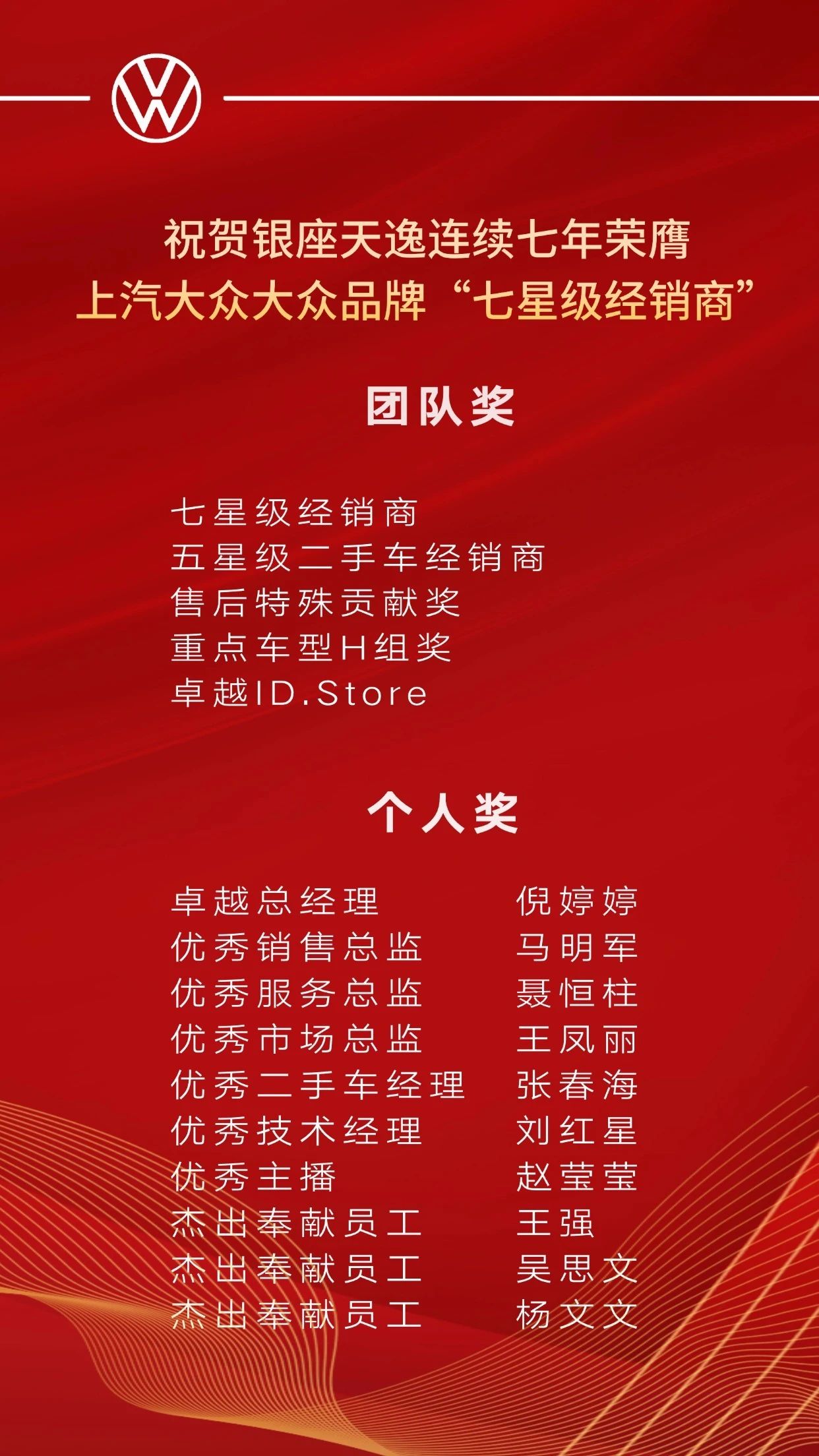 近日,在浙江湖州举行的上汽大众核心经销商会议中,银座汽车上汽大众店凭借卓越的综合运营实力、创新的服务模式及客户至上的经营理念,在全国近千家经销商中脱颖而出,以2024年度综合运营水平华中区第一、全国第二的成绩,七度蝉联上汽大众“七星级经销商”最高荣誉,荣获个人奖大满贯,实现团队与个人双线突破,再次彰显在激烈市场竞争中的稳健实力。